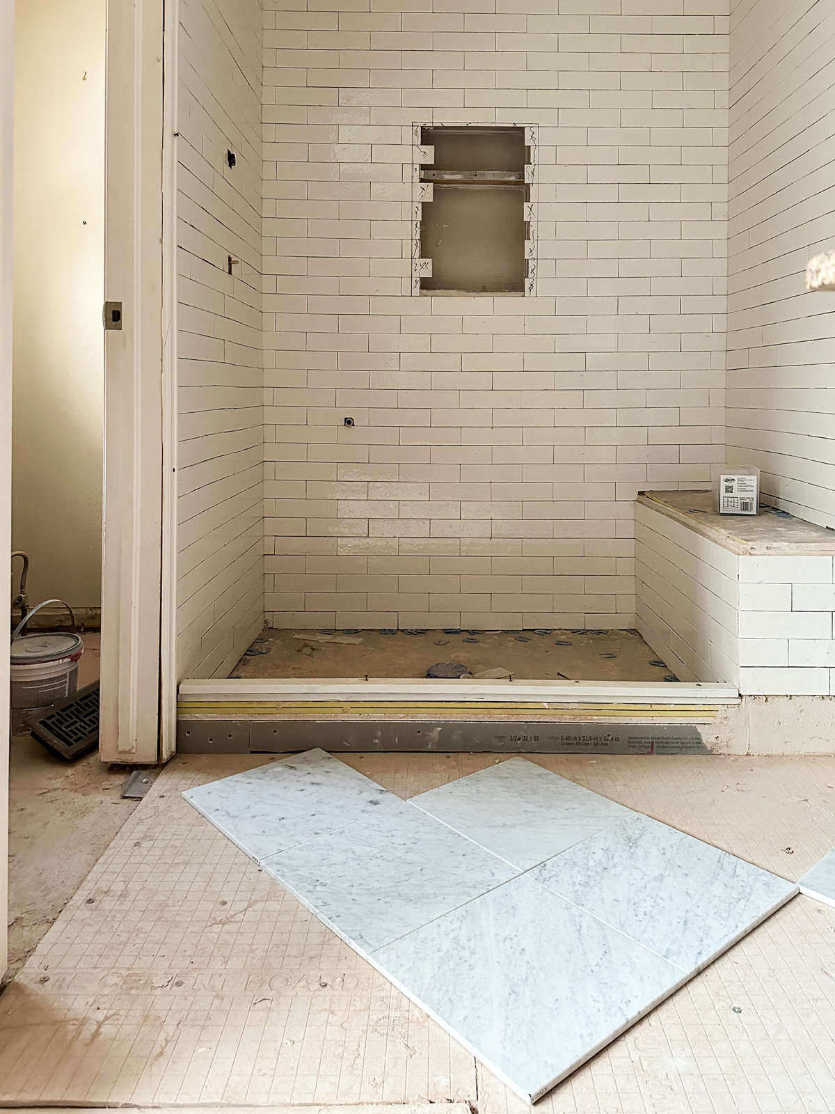 The Carrara marble floors are officially installed and I am absolutely in love with how they turned out! If you’ve been following along, you know that I was on the hunt for the perfect stone and found this beautiful marble for next to nothing. Seriously – all of the boxes we needed were half off of their original price and marked “as-is”. I got super lucky on this one!