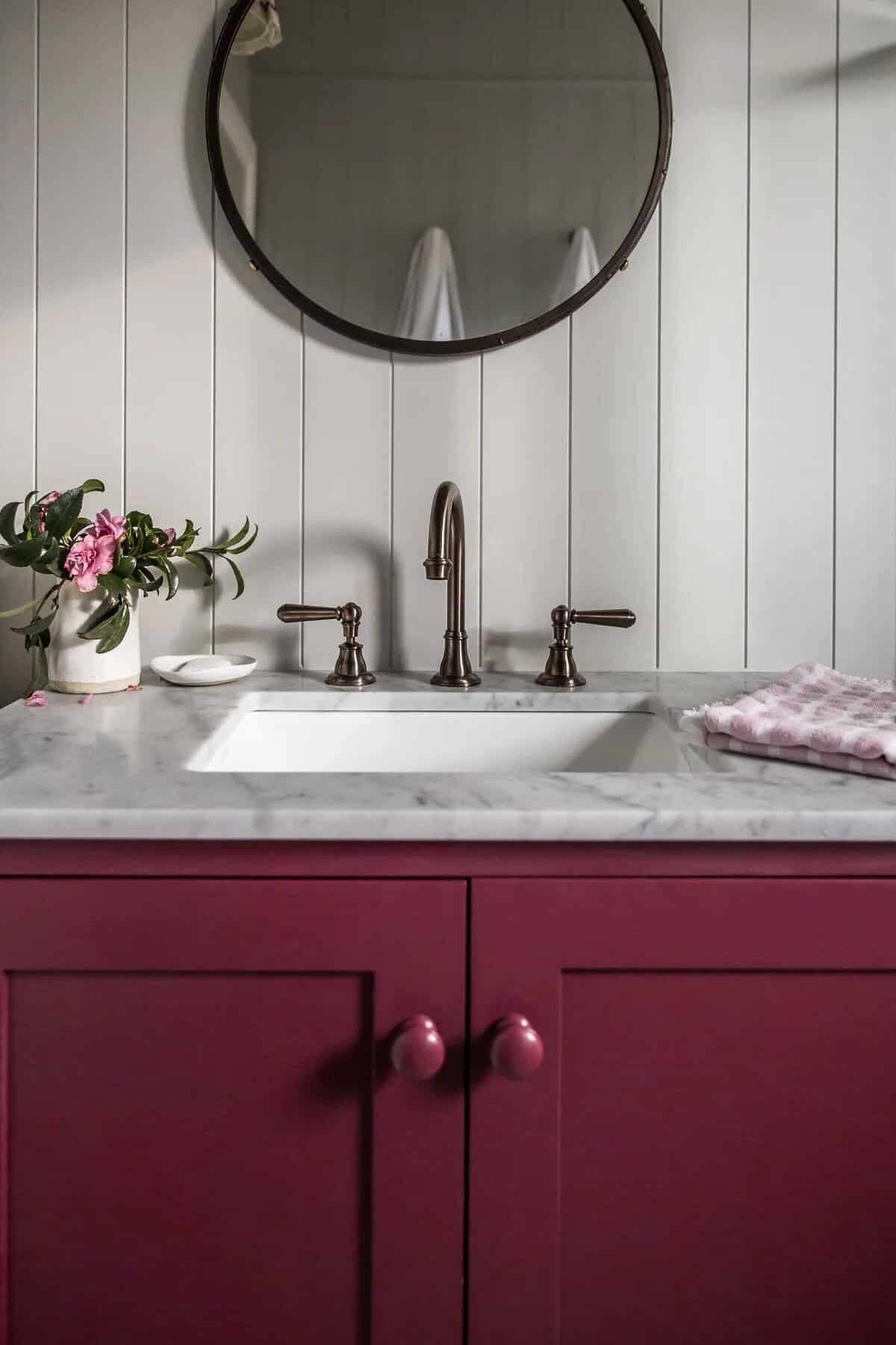Here’s another really fun example of using pink in a bold and impactful way. This bathroom by Cottonwood & Co. packs a punch and proves that even a small pop of color can completely transform a space. Surrounded by neutral elements like gray walls and marble finishes, this rich magenta pink shade brings an unexpected freshness and energy to the room. To soften the look, they’ve styled it with a blush pink hand towel and delicate florals. It’s these simple touches that really bring a room together.